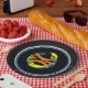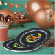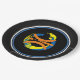 As jantes pretas circundam a placa com fundo preto e um gráfico/logotipo de basquete de arte moderna. 9 polegadas de tamanho e feitas de papel. Personalizar ou comprar como está.