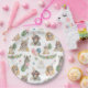 Traga um estilo safari divertido para a sua celebração com esses pratos de aniversário de animais da selva, apresentando uma coleção alegre de animais de festa em aquarela vestidos e prontos para celebrar. Um tigre elegante, um chimpanzé legal, uma zebra alegre soprando chiclete, um suricato brincalhão e um leão festivo aparecem ao longo do design usando chapéus de festa e óculos de sol, cercados por balões, estrelas, folhagens e detalhes de bolo de aniversário.