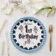 Placas de primeiro aniversario de baseball em macaco-meia, um design bonito que é excelente para crianças que adoram esportes, especialmente beisebol, e macacos fofos! Possui três jogadores de beisebol de macaco-meia em bonés de beisebol, um deslizando para a placa de casa, um no taco, um preparando-se para lançar a bola! O texto pontilhado de polka preto lê primeiro aniversario e há uma borda de listras azuis e brancas e um anel decorativo preto. Você pode personalizar facilmente estas placas de primeiro aniversario de baseball com um nome!