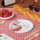 Sirva seus hóspedes com pratos de maçã vermelha. Os matifs de maçã caprichosa e padrões inspirados em coquetes criam um cenário de mesa doce e charmoso para o seu chá.