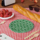 Um padrão verde festivo decora estas placas de papel de feriado. Estas placas de papel são excelentes para o Natal, janto de Natal, festa de Natal, festa de Natal, festa de escritório, festas de férias, casa aberta, troca de biscoitos, escola, igreja, etc... A design é de arte original.