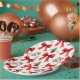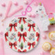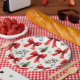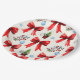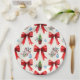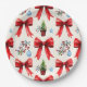 Coquette Christmas Plates que apresentam arcos vermelhos, conchas e árvores de Natal.