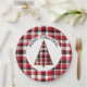 Estas placas de papel de Natal de Natal apresentam uma xadrez vermelha, branca e preta para o fundo. Um círculo branco aparece no centro onde reside uma árvore de Natal xadrez vermelha, branca e preta. Este design adicionará um talento de vintage à sua mesa de férias. Copyright Kathy Henis