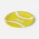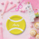 Placas de papel do partido amarelo feito sob encomenda do CHURRASCO da bola de tênis. Design bonito dos esportes com nome personalizado. Impressão do divertimento para o partido de aniversário de criança. Criar seus próprios com nomes da criança ou das crianças. Gráficos neutros para meninos e jogadores de ténis das meninas, treinador e fãs.