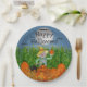 Espantalho bonito segurando um pequeno abóboras, com muitos morcegos em cima.