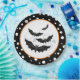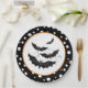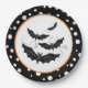 A placa de papel da festa do Dia das Bruxas é mostrada em uma design de bolinhas preto e branco com um impressão de morcegos. Personalize este item ou comprar como está. Mostrado no tamanho de 9". Vendido em embalagens de oito. Imagem do stock