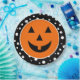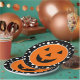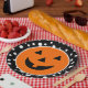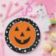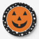 A placa de papel da festa do Dia das Bruxas é mostrada em uma design de bolinhas preto e branco com um impressão de rosto de abóbora. Personalize este item ou comprar como está. Mostrado no tamanho de 9". Vendido em embalagens de oito. Imagem do stock