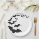 A placa de papel de festa do Dia das Bruxas é mostrada em cor branca com um impressão de morcegos. Personalize este item ou comprar como está. Mostrado no tamanho de 9". Vendido em embalagens de oito.