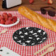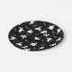 A placa de papel da festa do Dia das Bruxas é mostrada em um impressão de fantasmas e morcegos preto. Personalize este item ou comprar como está. Mostrado no tamanho de 7". Vendido em embalagens de oito.