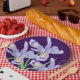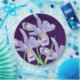 Placas de papel com flores roxas da íris contra fundo roxo profundo.