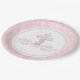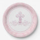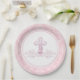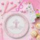 Chapas de papel batismo feminino com cruz de pérolas rosa bonito num fundo damasco rosa. Essas elegantes placas de papel de batismo rosa são facilmente personalizadas pela simples adição de texto. Você também pode mover a cruz conforme necessário sobre o batismo, batização e primeira placa de papel comunal, cor-de-rosa.