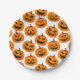 A placa de papel da festa do Dia das Bruxas é mostrada em um impressão assustador de abóboras. Personalize este item ou comprar como está. Mostrado no tamanho de 7". Vendido em embalagens de oito.