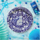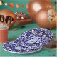 O meu design de placa de cerâmica original, de coelho azul e branco, é reinterpretado como uma placa de papel em alta escala.