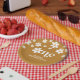 Um! Placas de primeiro aniversario inspiradas retroativamente com margaridas do estilo 70 e fontes e cores de som.