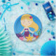 As placas de papel personalizadas do aniversário louro da sereia caracterizam uma sereia bonito com cabelo louro, a cauda roxa da sereia, a estrela do mar, a erva daninha do mar, o oceano azul, e uma área que você pode personalizar com o nome e idade da menina do aniversário!