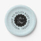 Personalize este menino bonitinho, chá de fraldas pratos pequenos, com listras azuis de gingham e etiqueta preta na dentro que diz, "É um menino".