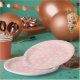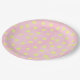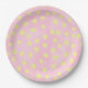 Pratos de papel com pontos cor-de-rosa e amarelos da Primavera. O design pode ser transferido para guardanapos de papel correspondentes.