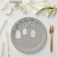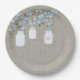 Pratos de papel para chá de bebê com potes de pedra e aniagem com ramo de flor de cerejeira azul em um fundo rústico de aniagem. Você pode adicionar texto aos potes e alterar o texto no coração.