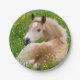 Um potro bonito de Haflinger encontra-se em um prado de florescência verde com muitas flores amarelas dos botões de ouro. A raça do cavalo da castanha com uma juba flaxen loura igualmente chamou avelignese ou haffies. Uma foto bonito e enchanting do potro tomada por Katho Menden. Estas placas de papel do partido descartável engraçado são uma ideia do presente para amantes do cavalo. http://www.zazzle.com/kathom_photo