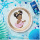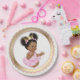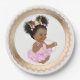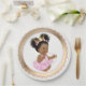 Pratos de papel rosa e dourado para chá de bebê com adorável menina bebê americana africana em um belo fundo rosa e dourado. Estes adoráveis pratos de papel para chá de bebê de menina bebê étnica são facilmente personalizados com texto e você também pode alterar a cor do fundo.