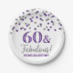 60 e placas de festa de aniversário fabulosas com um padrão de brilho prateado e roxo.