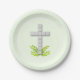 Cruz branca cor-de-rosa sobre verduras folha em placas de papel verde da casa da moeda, de 7" ou 9". Design perfeito para Primeira Comunhão, Batismo, Cristo, Dedicação ou qualquer ocasião religiosa especial. CORRESPONDENDO a itens na nossa loja.