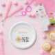 Primeira viagem ao redor do primeiro convite de aniversário. primeiro aniversario neutro de gênero, rapaz ou tema de festa de menina. Gráficos brilhantes e bonitos do Sol com tons terríveis. Conjunto de decorações da parte correspondente com fonte clara e verde, Pastos cor-de-laranja azul verde