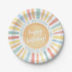 Feliz Aniversário Placa de Papel Sunshine. Este alegre design de placa de papel apresenta um sol vibrante no centro, com "Parabéns" exibido em cima. Os raios solares brilham numa mistura de amarelo, laranja, vermelho, lacrimejo e azul, criando um aspecto brilhante e alegre perfeito para uma Primeira Viagem à Volta do primeiro aniversario Sol. Totalmente personalizável, você pode ajustar o texto, as cores ou os elementos de design para corresponder ao seu evento. Uma adição divertida e festiva ao seu dia especial!