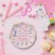 Comemore o primeiro aniversário da sua garotinha com esta adorável e personalizada placa de papel com tema de dinossauros. Estes pratos da Festa de Dinossauro Bonita são perfeitos para o dia especial de uma menina. Apresentando dinossauros bonitos em blues, pinks e lilás, estes deliciosos dinos estão segurando balões cor-de-rosa e lilás alegres e pastel de bolinhas. As borboletas brancas flutuam, acrescentando um toque extra de magia. Com a frase "Stomp Chomp Roar", eles prometem um dia de diversão com dinossauros. Colocada sobre um fundo cor-de-rosa pastel, a design é completada com folhas e folhagem verdes e macios. Torne o primeiro aniversário da sua menina realmente memorável com estas pratos de papel encantadoras!