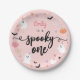 Um prato de papel de primeiro aniversario fantasma fofo do Halloween. Design moderno do Dia das Bruxas para uma festa assustadora! Esta placa de aniversário apresenta teias de aranha, fantasmas, abóboras, morcegos, aranhas, folhas, cornas, estrelas e margaridas. Esta placa de papel é excelente para festas de aniversário de meninas!