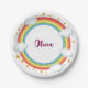 Esta placa de papel divertida apresenta um arco-íris vibrante que forma um quadro circular para um nome personalizável, acentuado por nuvens fofinhas e estrelas ouros.