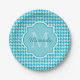 Turquesa chica e placas de papel monograma de padrão aqua houndstooth com uma elegante moldura bordada você pode adicionar o nome e monograma inicial da dama do partido. Este design de na moda adicionará classe e sofisticação ao estilo da sua festa.
