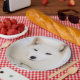 Uma raposa-ártica branca, descansando na neve. O animal tem pele branca e olhos castanhos e está olhando para você. Um verdadeiro diva! Guardanapos de papel correspondentes: