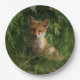 Placas de papel com uma fotografia com uma raposa de bebê giro com pelo vermelho e branco. Cercados por folhas e gramíneas verdes e peludas.