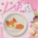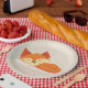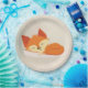 Placas de papel com desenho de uma adorável raposa laranja dormindo pacificamente. Um fundo castanho claro com formas geométricas esmaecidas.