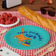 velociraptor laranja brilhante comendo bolo com 3 velas