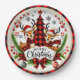 A Cute Merry Christmas Red And Black Buffalo Plaid Round Party Paper Plate With Tree And Two Cute Deer