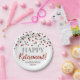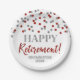 Placas de aposentadoria felizes personalizadas em um padrão de confete vermelho e prateado.