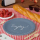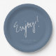 This modern wedding set has a warm, personal feel and many pieces feature an abstract, watercolor design resembling reflections on water. This coordinating paper plate has a solid color background of dark dusty blue, striking calligraphy of 'Enjoy' along with your names and wedding date. Search ID774 to see the complete set of matching products and additional color options for this design.