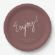 Este casamento moderno tem uma sensação quente e pessoal e muitas peças apresentam um abstrato, design de aquarela, semelhante a reflexões sobre a água. Esta placa de papel coordenadora tem um fundo de cor sólida de canela profunda, uma caligrafia impressionante de "Aproveite" junto com seus nomes e data de casamento. Procure ID774 para ver o conjunto completo de produtos correspondentes e opções de cores adicionais para este design.