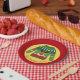 Faça seu jantar de convidado da festa com esta divertida e sedutora rena de suéter feia, prato de papel aperitivo redondo. Apresenta uma suéter feia de rena com cor de fundo amarela e vermelha.