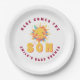 Prato De Papel Retro Aqui Vem O Chá de fraldas Do Filho Menino