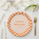 These personalized paper plates feature a bold retro checker pattern in warm orange tones with a soft peach center and custom baby shower text. A playful yet stylish choice for serving cake, desserts, or light bites, they add a coordinated look to baby shower tables and dessert displays. The groovy abstract design brings a fun, nostalgic feel while still feeling polished and party-ready. Personalize the name and date to match your baby shower theme and coordinating decor.