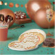 Quatro Ever Groovy! Retro inspirou as 4.ª pratos de aniversário com fontes e cores do estilo 70, arco-íris e margaridas em cores de outono. cor marrom, bronzeada e laranja.