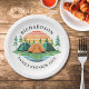 Criar placas de papel personalizadas para uma festa de reunião de família organizada em um tema de acampamento. O design apresenta uma ilustração antiga do pôr do sol com tendas em uma floresta de pinheiros perto de um lago sobre fundo branco. O modelo facilita a personalização do texto com seu sobrenome e ano.
