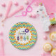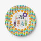 Robôs As placas de papel da festa do 4º aniversário contêm quatro robôs azuis, verdes, laranja e roxos com muitas antenas, botões, luzes, engrenagens, texto que diz "I m FOUR", e uma grande borda de faixas de chevron em azul, verde, marrom, branco e laranja!