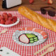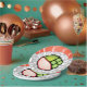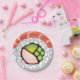Fim-acima de um rolo de sushi. O divertimento e o design colorido da placa são grandes para qualquer um que ama o sushi.