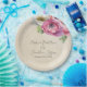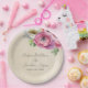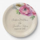 Esses pratos florais românticos em estilo vintage apresentam um design rústico de papel pergaminho com flores de ranunculus brancas e rosas em aquarela. Um delicado buquê de ranunculus e folhagens é retratado na parte superior. Nomes de amostra de um casal recém-casado e data de casamento são impressos na parte superior. Você pode personalizar os pratos para incluir seus próprios nomes ou texto personalizado.