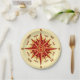 Uma imagem gráfica simples de uma rosa de bússola de safra que mostra todos os 16 pontos da bússola em tons de vermelho com letras castanhas em fundo dourado e creme colorido.