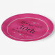 Esses pratos de festa personalizados apresentam um design glamoroso. Uma borda cintilante de brilho rosa falso emoldura o prato. O fundo é um design de folha metálica rosa quente com aparência brilhante. Um nome de amostra e uma data de aniversário são impressos no centro, que você pode personalizar para incluir seu próprio nome, título do evento ou outro texto. Diamantes acentuam as partes superior e inferior da área de texto. É perfeito para um aniversário, chá de noiva ou outro evento especial.